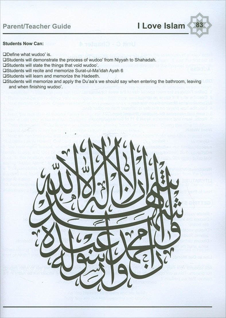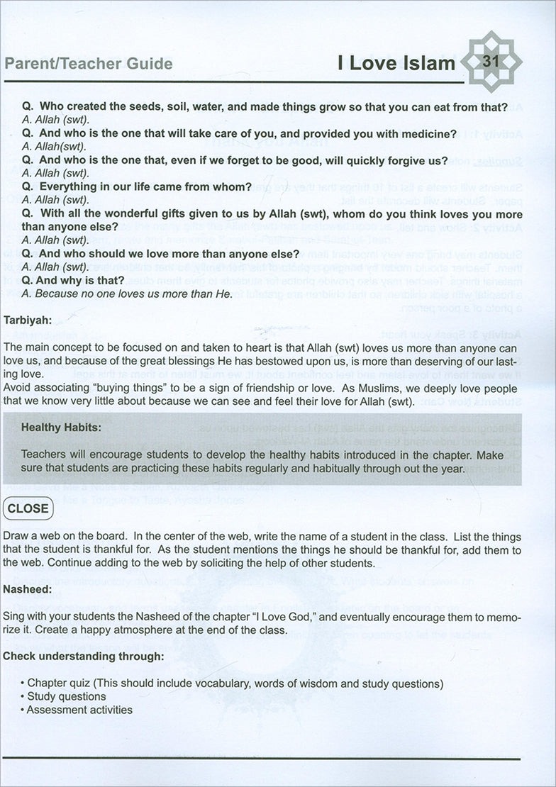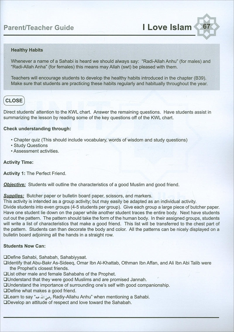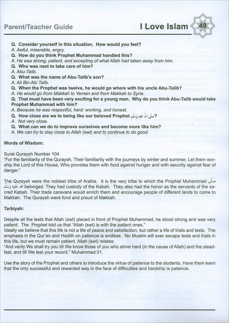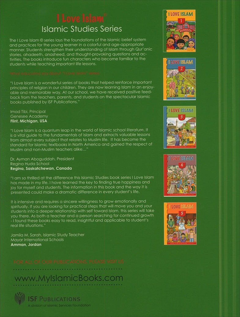 I Love Islam is a series of Islamic studies textbooks and workbooks that gradually introduces the Muslim student to the essentials of his faith, and bring to light the historic and cultural aspects of Islam. The series cover grades one through five, and include a student textbook and workbook as well as a teacher’s edition.