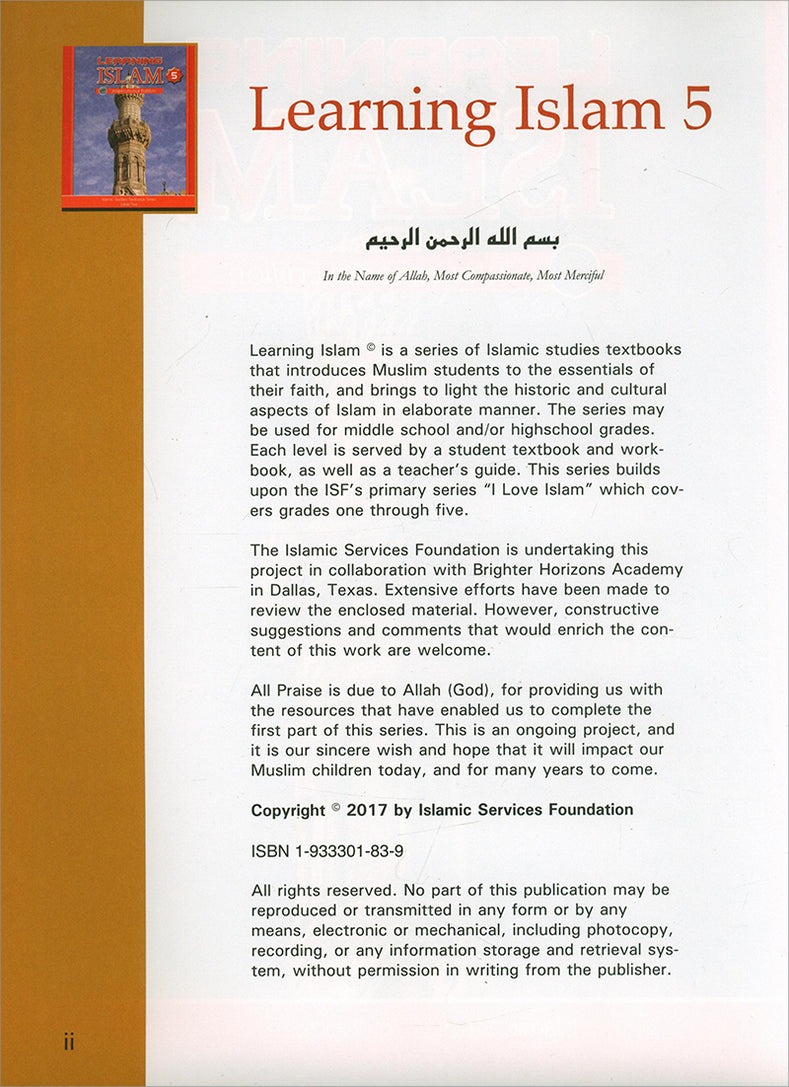 Learning Islam is a series of Islamic studies textbooks that introduces Muslim students to the essentials of their faith, and brings to light the historic and cultural aspects of Islam in elaborate manner. The series may be used for middle school and/or high school grades. Each level is served by a student textbook and workbook, as well as a teacher’s guide. This series builds upon the ISF’s primary series “I Love Islam” which covers grades one through five. ISLAYE What educators say about “I Love Islam” series “As the founder of Al-Muminah School, it was my duty to identify a quality Islamic Studies curriculum that provides relevant, interactive, and interesting learning. Over the years we have used Islamic Studies books from around the world. Although many of these publications have certain strengths, I have not encountered a series of books, like I Love Islam and Living Islam, that encompasses ALL the foundational aspects of Islamic learning in a comprehensive and interesting manner. Not only do the ISF Publications’ books enable teachers to easily engage in language and literacy activities in all elements of instruction, but they also provide students with the necessary tools in problem solving to develop abstract, analytic thinking skills. Parents, teachers, and students alike have been satisfied with ISF Publications books.” Dr. Shehnaz Shaikh LEARNING ISLAM Founder Al-Muminah School System Mumbai, India ISLAM “ISF Publications Islamic Studies series are a wonderful series of books that helped reinforce important principles of religion in our children. They are now learning Islam in an enjoyable and memorable way. At our school, we have received positive feedback from the teachers, parents, and students on the spectacular Islamic books published by ISF Publications.” Imad Tibi, Principal Genesee Academy Flint, Michigan, USA “ISF Publications Islamic Studies series are a quantum leap in the world of Islamic school literature. It is a vital guide to the fundamentals of Islam and extracts valuable lessons from almost every subject that relates to Muslim life. It has become the standard for Islamic textbooks in North America and gained the respect of Muslim and non-Muslim teachers alike… LEARN ISLAM Dr. Ayman Aboguddah, President Regina Huda School Regina, Saskatchewan, Canada
