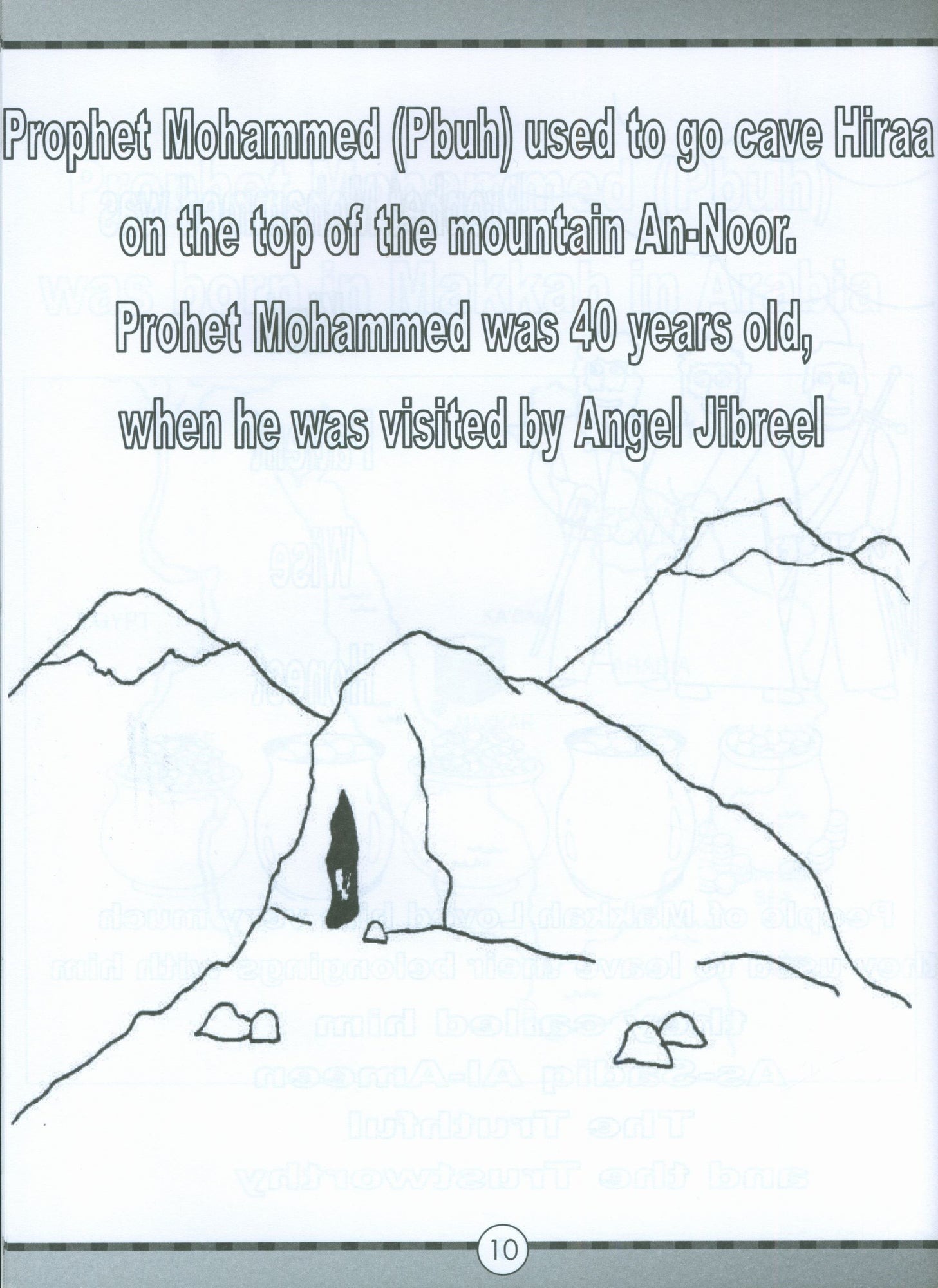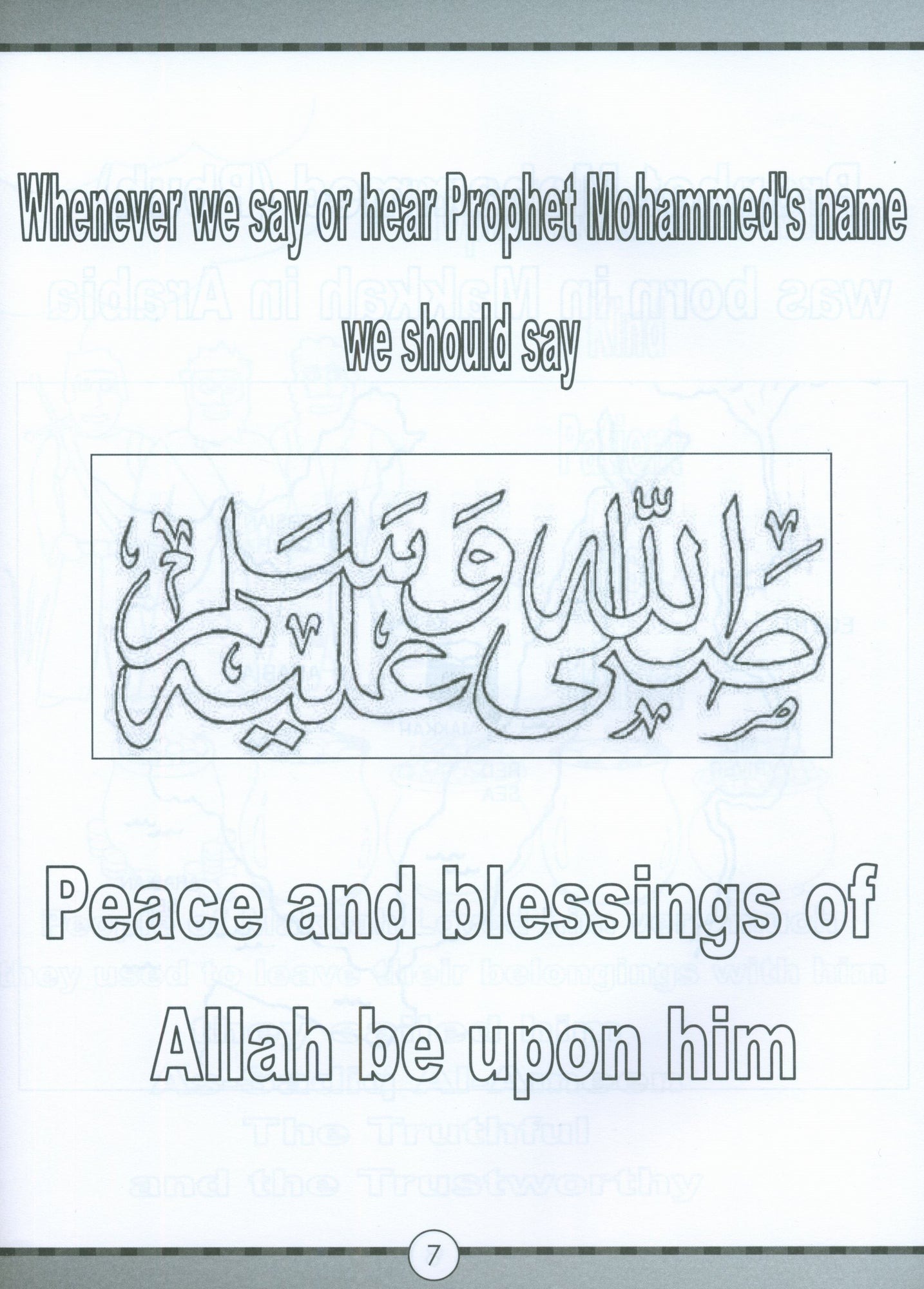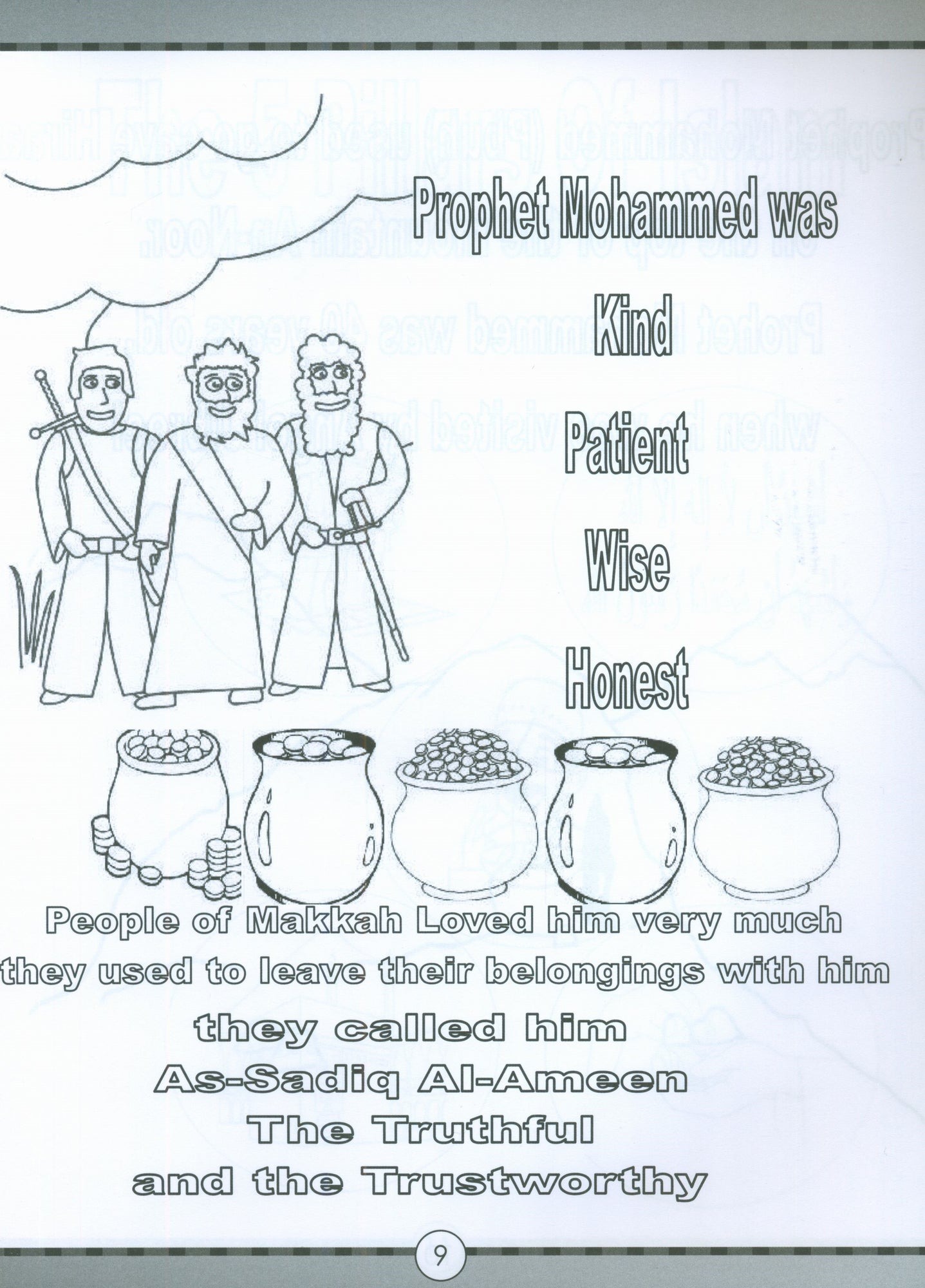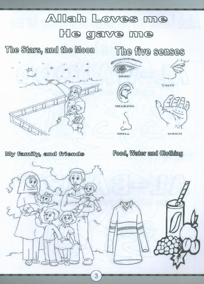 This coloring book is good for ages 4-8. Every page in this book has an Islamic lesson expressed through pictures. The book covers all aspects of Islam every child in that age range needs to know. It is divided into the following sections: Allah (SWT), Prophet Muhammad (pbuh), Pillars of Islam, Pillars of Iman, the three holy places, Manners, Duaa’s, and finally the importance of learning the Quran and teaching it.