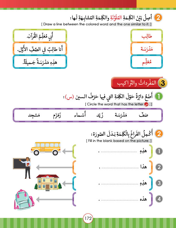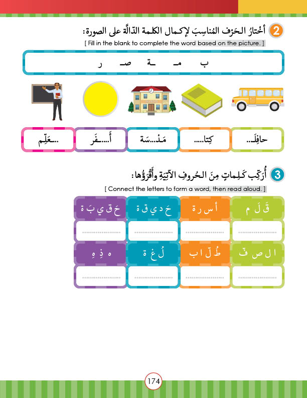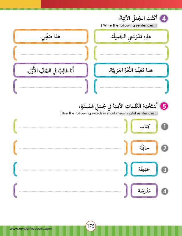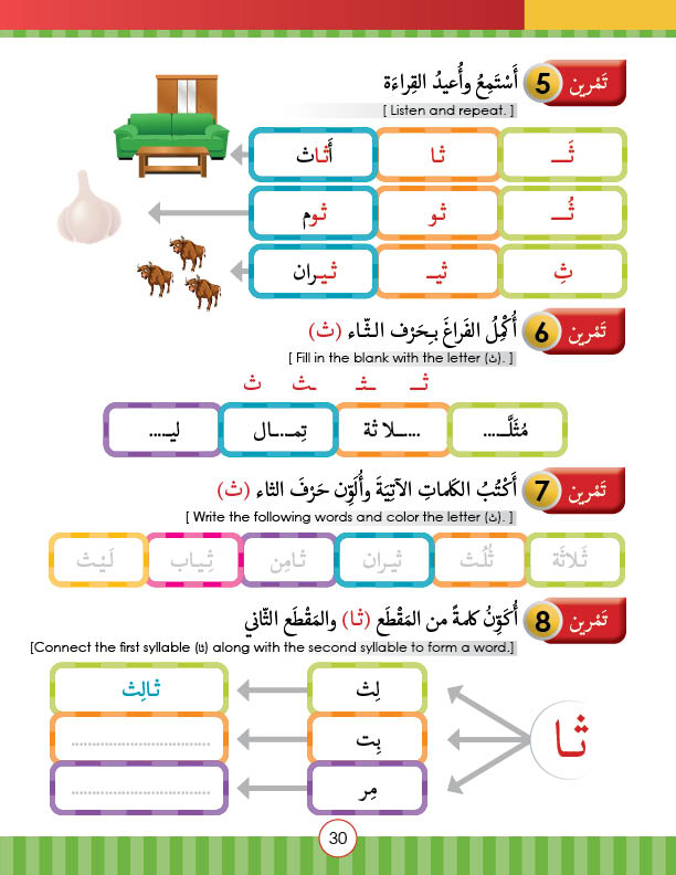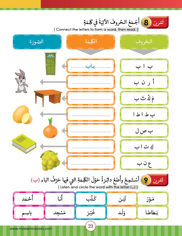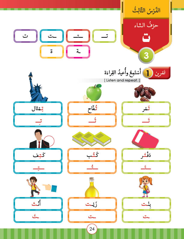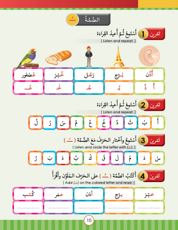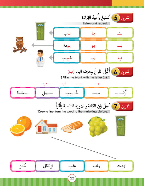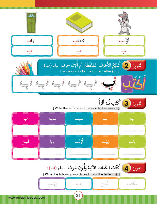 يرافق كتاب الطالب كتاب تمارين لتعزيز مهارات الاستيعاب والكتابة. يتضمن نشاطات تلوين وتوصيل ممتعة مع تمارين لممارسة تكوين الاحرف وتعزيز المبادئ.