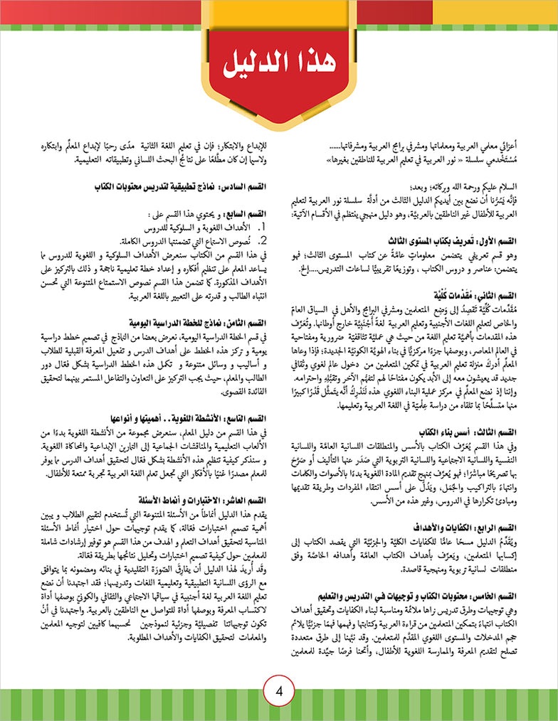 السلام عليكم ورحمة الله وبركاته؛ وبعد؛ فإنه يسرنا أن نضع بين أيديكم الدليل الثالث من أدلة سلسلة نور العربية لتعليم العربية للأطفال غير الناطقين بالعربية، وهو دليل منهجي ينتظم في الأقسام الآتية:
