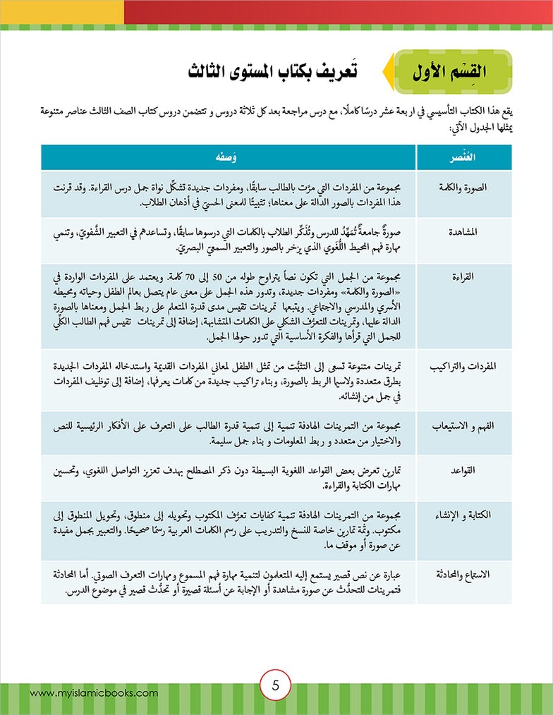 Peace be upon you, We are pleased to present to you the third guide in the “Noor Al-Arabia” series for teaching Arabic to non-Arabic speaking children. This methodological guide includes the following sections: