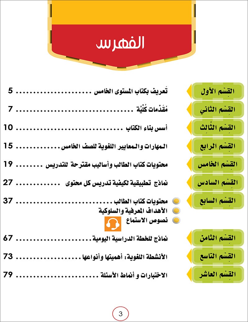 عرضًا شاملًا لكتاب الطالب للمستوى الخامس، يشمل الموضوعات، المهارات المستهدفة، وتوزيعًا مقترحًا للزمن.