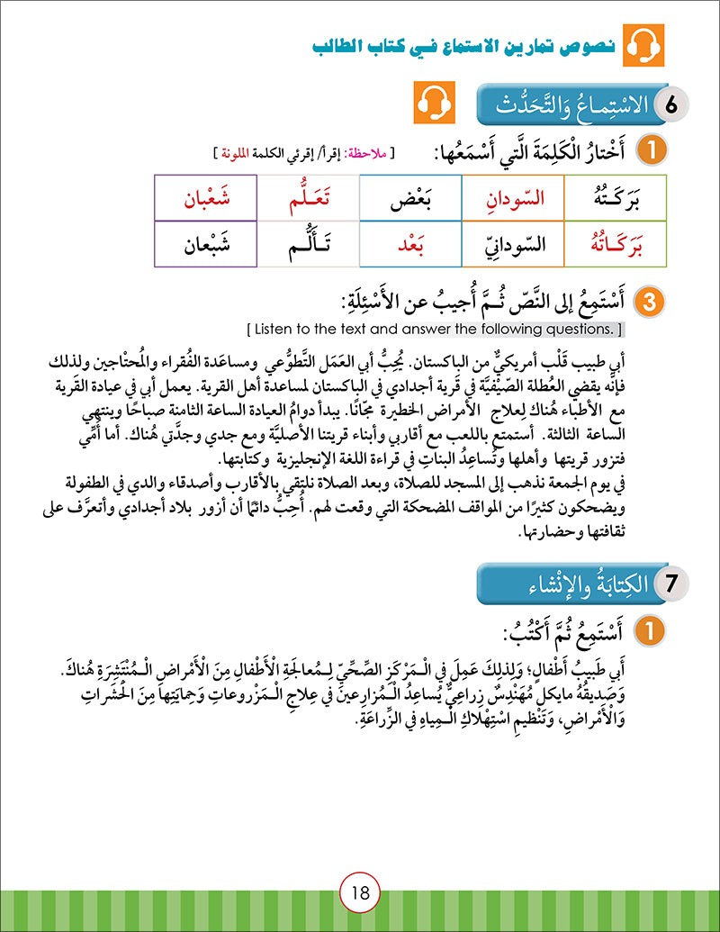 نصوص استماع وأسئلة فهم تساعد على تطوير الطلاقة والتعبير الشفوي.